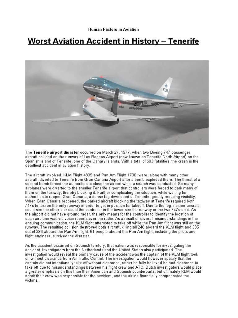 On march 27, 1977, two boeing 747 passenger jets, operating klm flight 4805 and pan am flight 1736, collided on the runway at los rodeos airport (now tenerife north airport). The tenerife airport is unusual in that it sits atop high cliffs, 2000′ above the atlantic— cloud altitude. The tenerife airport disaster occurred on sunday, march 27, 1977, when two boeing 747 passenger aircraft collided on the runway of los rodeos airport (now known as tenerife north airport). My recommendation is to discuss the tenerife airport disaster at your next safety meeting. The following 51 files are in this category, out of 51 total.